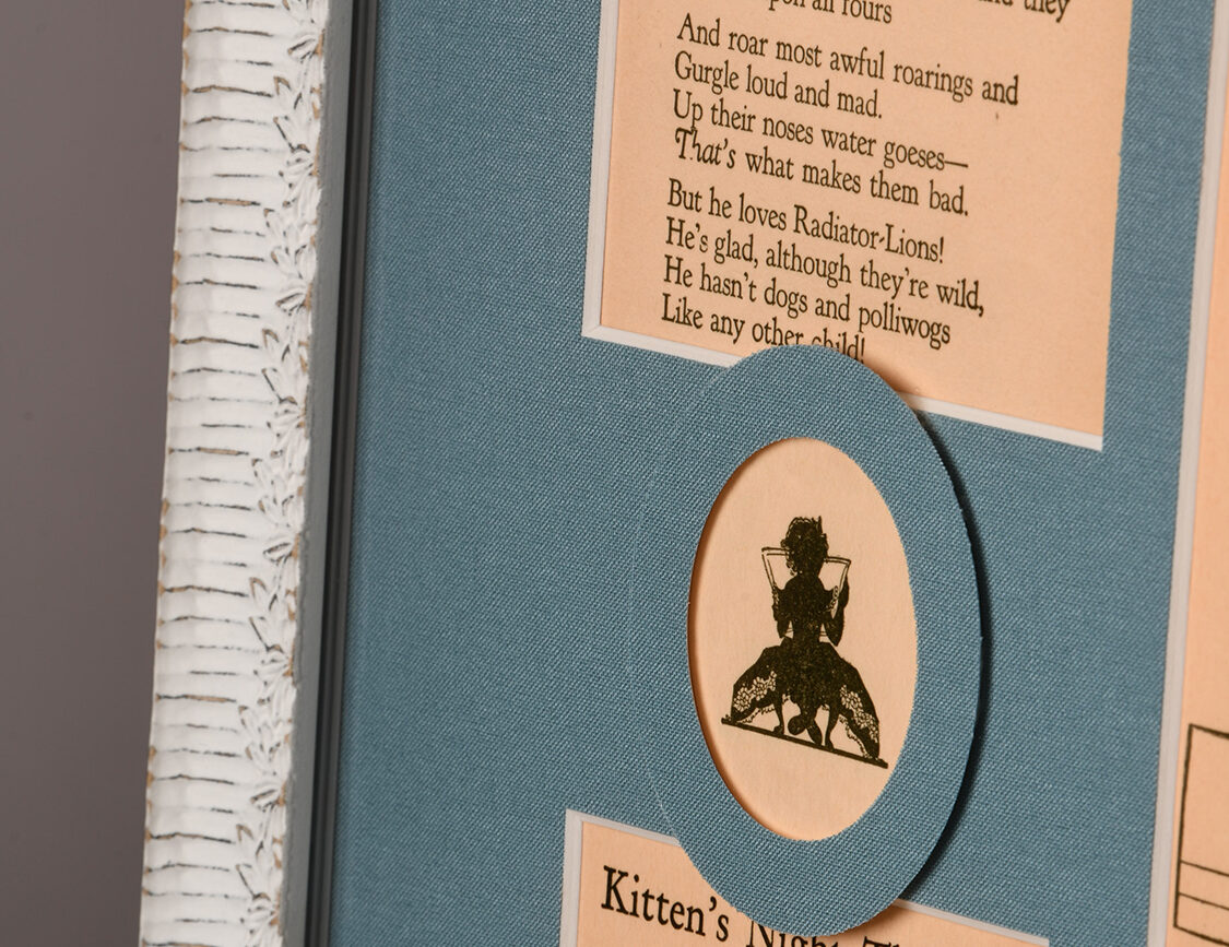 There were too many poems to include in the frame, so our client chose her favorites from the book. We shot the selected pages, and Mary Lou designed a beautifully balanced layout for the frame, which was not an easy feat considering the varying lengths of each poem. Shooting, restoring, and reprinting the poems not only allowed us to keep the book intact, but control the end result. Our archival prints will not fade like the original pages would, and we were able to print the exact size we needed for the frame, something we could not guarantee if we were using original pages and margins. It also allowed us to pick a few extra illustrations to incorporate into the design.