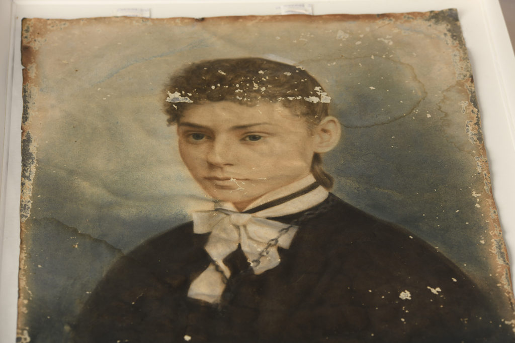 Crayon portraits were lightly exposed and hand-embellished with color. The artist would draw in the latest fashions on their clothing lapels or add items like hairpieces to the portrait. Over time, these portraits fragile paper yellow and fade, becoming brittle and fragile. The charcoal and oils are still strong in detail, but can be easily destroyed by mishandling.